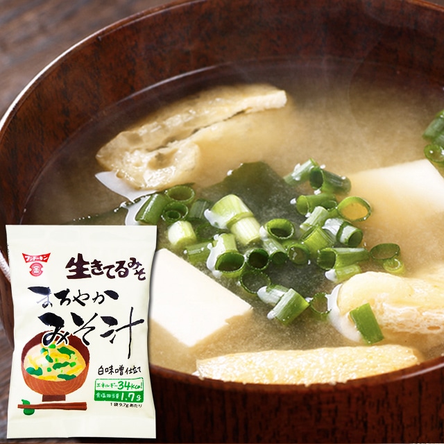 | フンドーキンフリーズドライまろやかみそ汁は、やさしい甘さのまろやかな味わい。ねぎ・油揚げ・わかめの入った、白みそ仕立てのインスタントのおみそ汁です。 | |